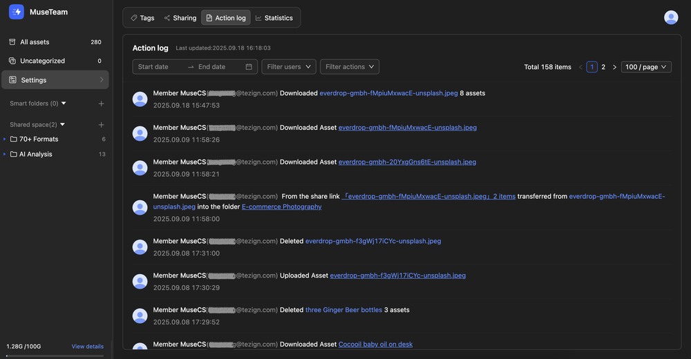 The Action Log is MuseDAM's comprehensive audit feature, giving admins a detailed, searchable record of everything that happens across the workspace. The system automatically tracks 60+ types of user activity โ including asset uploads, downloads, shares, edits, transfers, member invitations, and team changes โ logged in real time and accurate to the minute. Combine filters by time range, user, and action type to zero in on exactly the records you need, whether for internal compliance, security monitoring, or general team oversight.