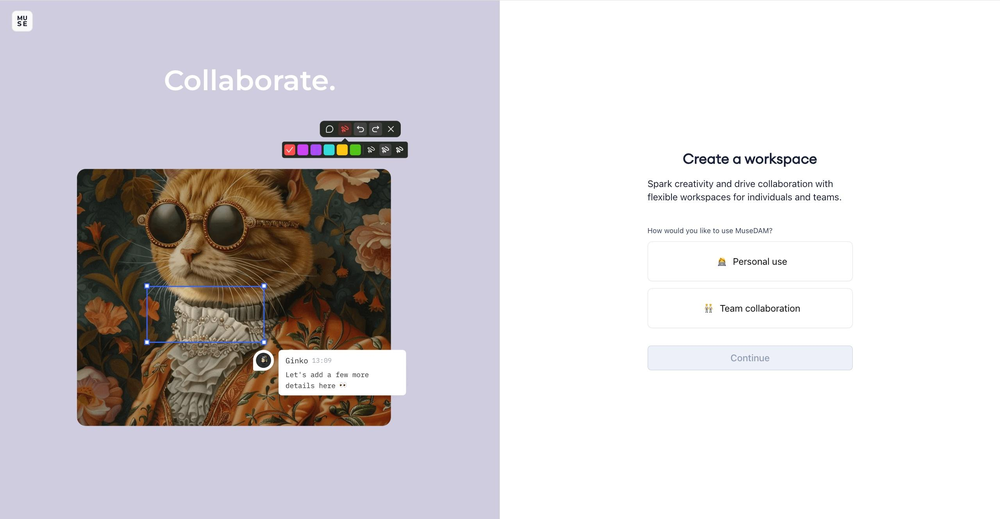 A Team Trial Workspace is MuseDAM's collaborative digital asset management environment for small teams â supporting multi-user collaboration, permission management, and resource configuration. When you log in to MuseDAM for the first time, the system will guide you through setting up your workspace. Simply choose Team Collaboration mode, fill in a few basic details, and you're ready to go. You'll also get a dedicated invite link to share with your teammates right away.