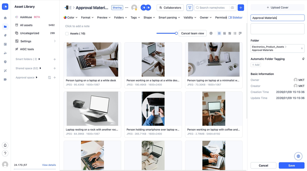 MuseDAM lets you personalize your folders in a few meaningful ways â upload a custom cover image, update the name and notes, and set up automatic tags. These details help your team identify and navigate folder contents at a glance, while auto-tagging ensures that assets are categorized automatically the moment they're uploaded, keeping your library organized without the manual effort.