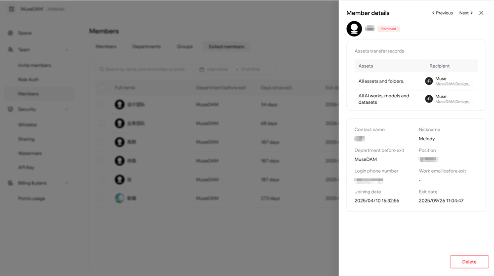 The Former Members feature gives admins a clear record of everyone who has left the workspace โ including their historical department and role, exit date, and asset transfer details. Click on any former member to open their full Member Details panel, where you'll find a complete profile alongside a record of how their assets were handed over.
