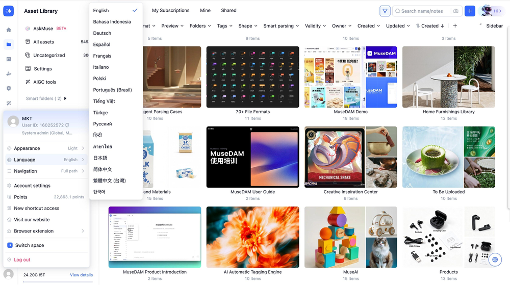 MuseDAM supports 17 interface languages, covering major markets around the world — including Simplified Chinese, Traditional Chinese, English, Japanese, Korean, Indonesian, German, Spanish, French, Italian, Polish, Portuguese, Vietnamese, Turkish, Russian, Hindi, and Thai.