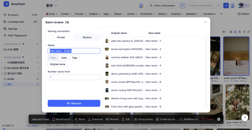 MuseDAM's Batch Rename feature lets you rename multiple assets at once using two flexible approaches:
