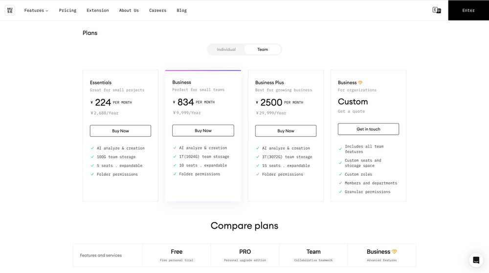 MuseDAM offers three team plans â Starter, Pro, and Ultimate â designed to fit teams of different sizes and digital asset management needs. Choose the plan that best matches your team's headcount, storage requirements, and feature needs. If your organization has more advanced requirements or enterprise-scale use cases, you can request an Enterprise demo to explore a tailored solution.