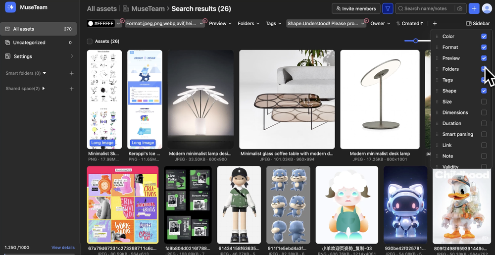 Advanced Filters let you zero in on exactly the assets you need β whether you're searching across your entire library or within a specific folder. Filter by multiple attributes including color, format, folder, tags, shape, owner, and more. You can also sort results by creation date, last modified date, and other criteria to help your team work more efficiently across large asset collections.