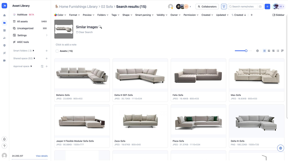 Once uploaded, MuseDAM automatically analyzes the image and returns visually similar assets from your current folder. If triggered from All Assets, the full library is searched