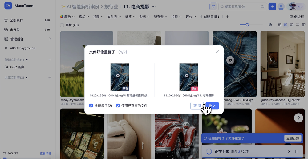 MuseDAM features intelligent Duplicate File Detection that automatically identifies identical content during the upload process. This proactive tool helps your team prevent asset redundancy, maintain a clean and organized library, and significantly optimize your storage efficiency.
